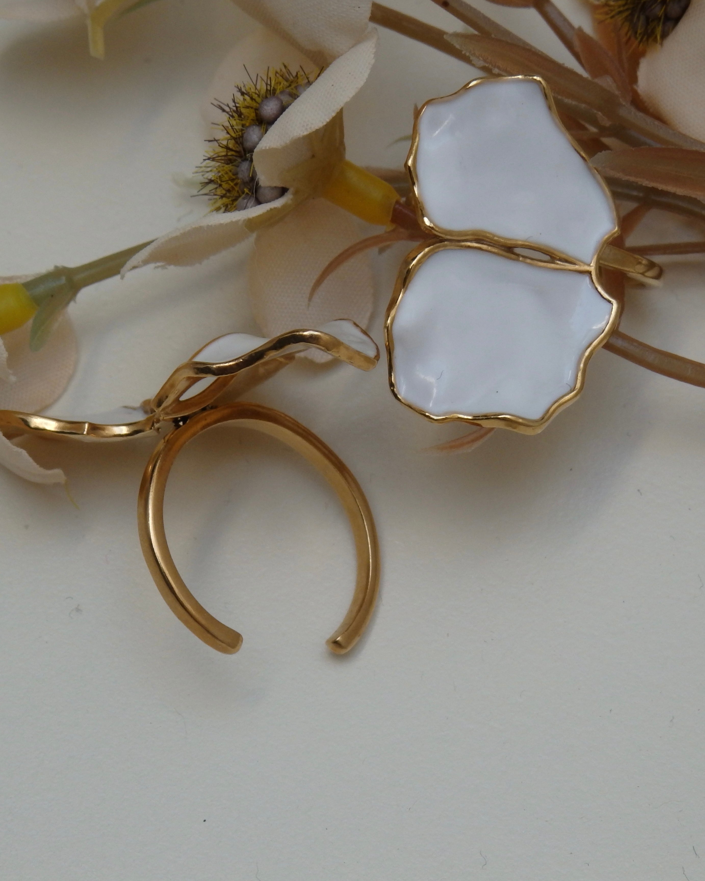An innovative two part ring that can be worn together as one, or in half as two. The rings are left open so they can be stretched and squeezed to fit your fingers. Handmade by skilled artisans in Guimaraes, Portugal, each petal is hand-painted with enamel. Available in 925. sterling silver and 18k gold plated.